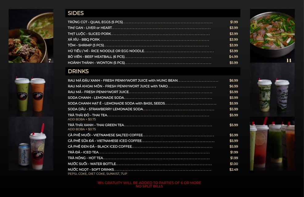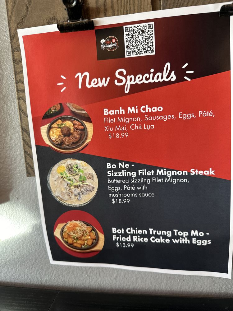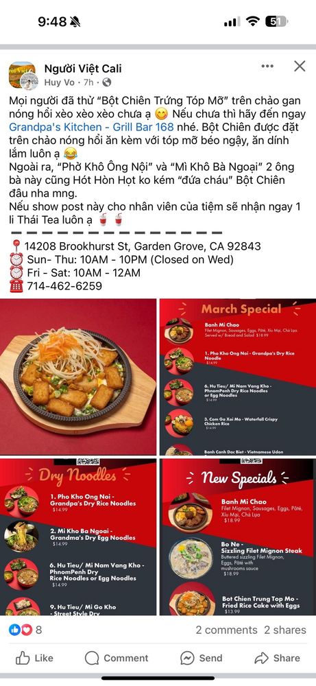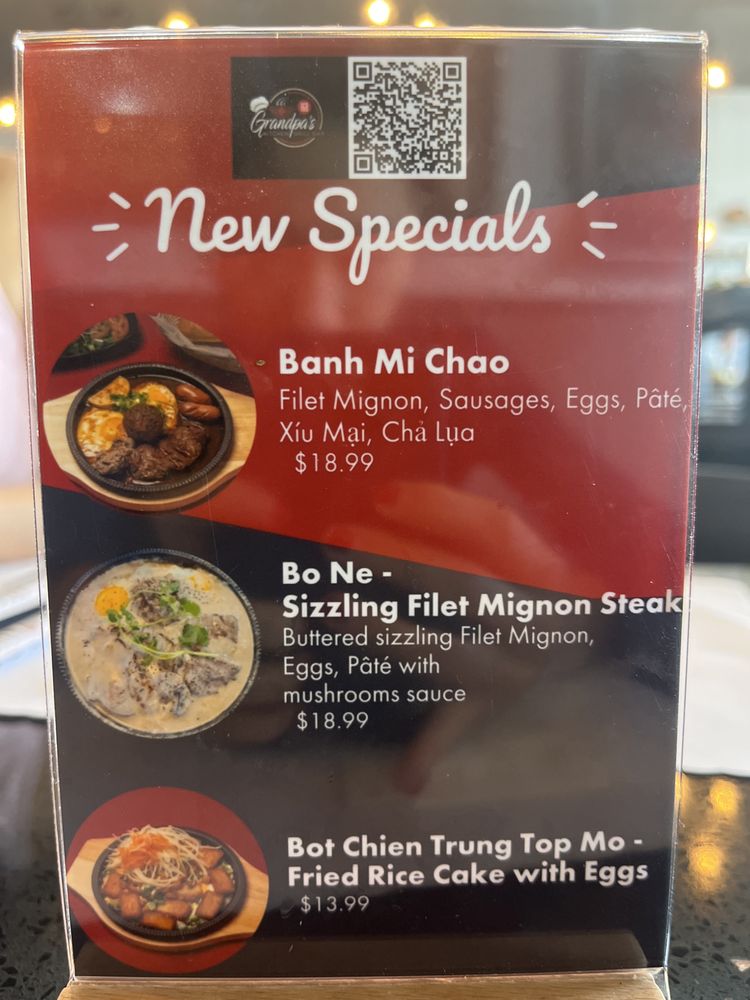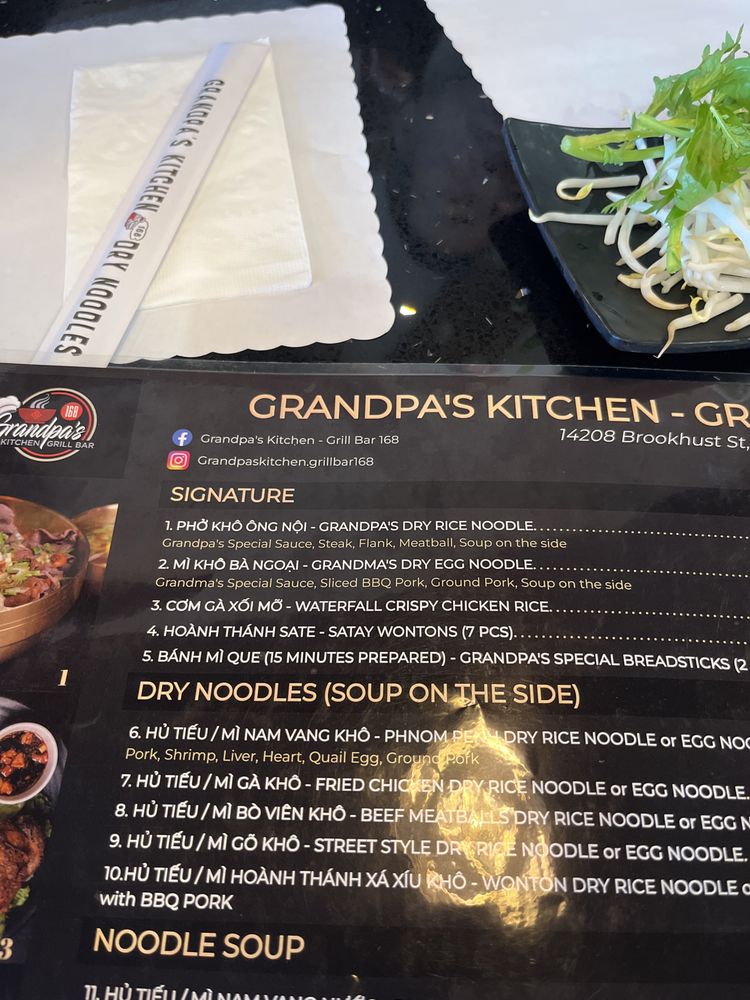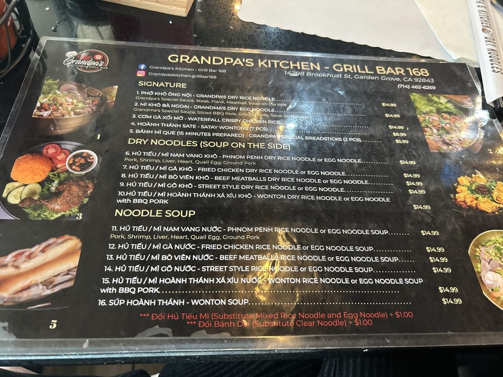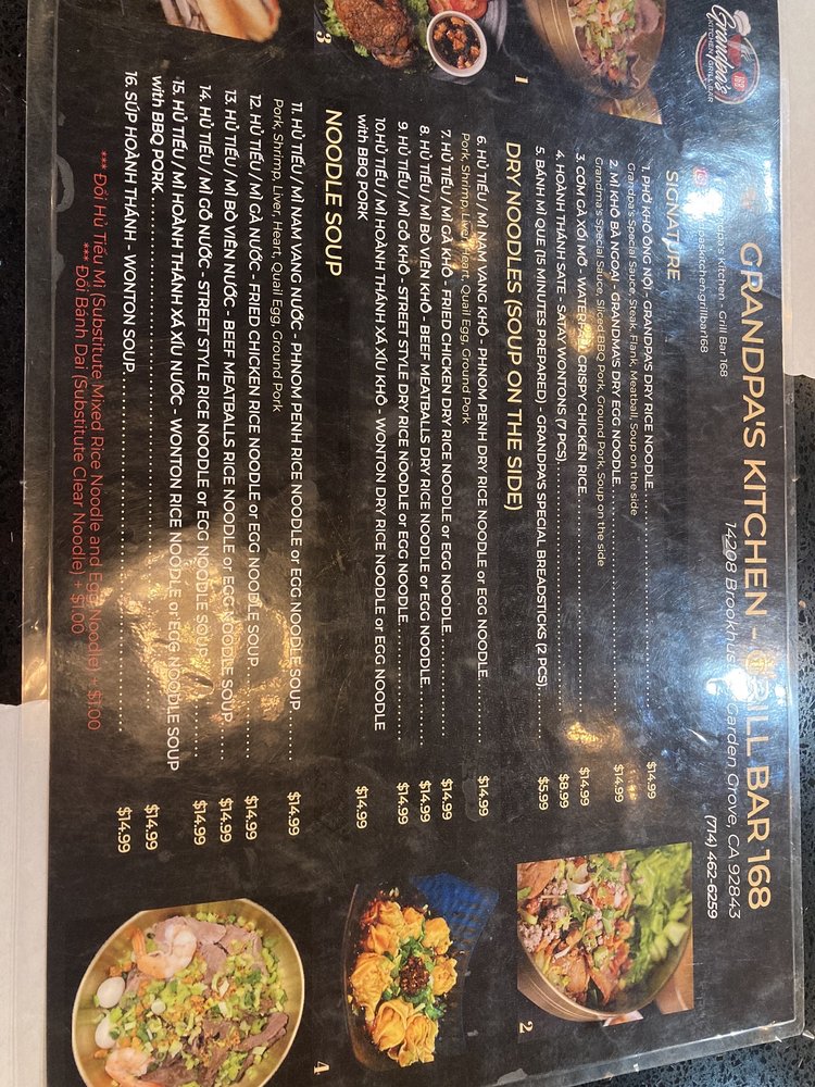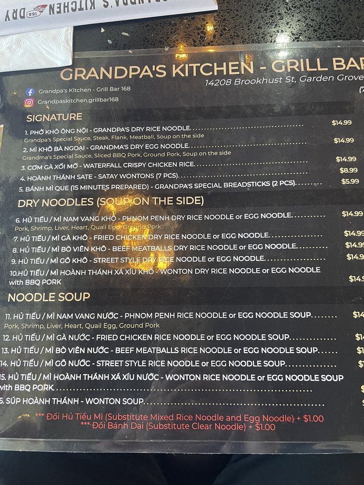 Welcome to Grandpa’s Kitchen - Grill Bar 168, where the flavors of Vietnamese and Asian fusion cuisine shine bright. Located in Garden Grove, CA, this restaurant offers a wide range of dishes perfect for breakfast, brunch, lunch, dinner, and late-night cravings. From the tender Bo ne with mushroom sauce to the flavorful Banh mi chao, every dish here is a culinary delight. Customers rave about the Hu tieu soup, the Grandmas egg noodles, and the Mi kho ba ngoai. The generous portions and impeccable service make this spot a standout in the noodle scene. Whether you're a fan of noodles, grilled meats, or hearty soups, Grandpa’s Kitchen - Grill Bar 168 is a must-visit for anyone seeking noodle perfection in a casual and trendy setting. Come and experience the delectable offerings at this restaurant that will leave you craving for more.